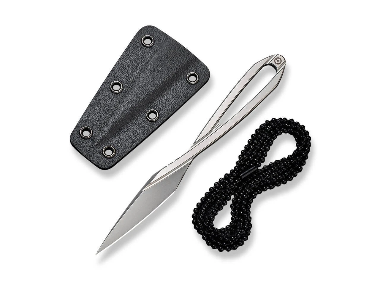 Das silberne Neck-Knife aus der Feder von Ostap Hel fällt besonders durch seine klare Formensprache auf. Kantige Elemente im Einklang mit geschwungenen Details prägen das feststehende Messer, das komplett aus D2 besteht und seine eigene Definition vom Goldenen Schnitt mitbringt. Lieferung mit Kydexscheide und Kugelkette.