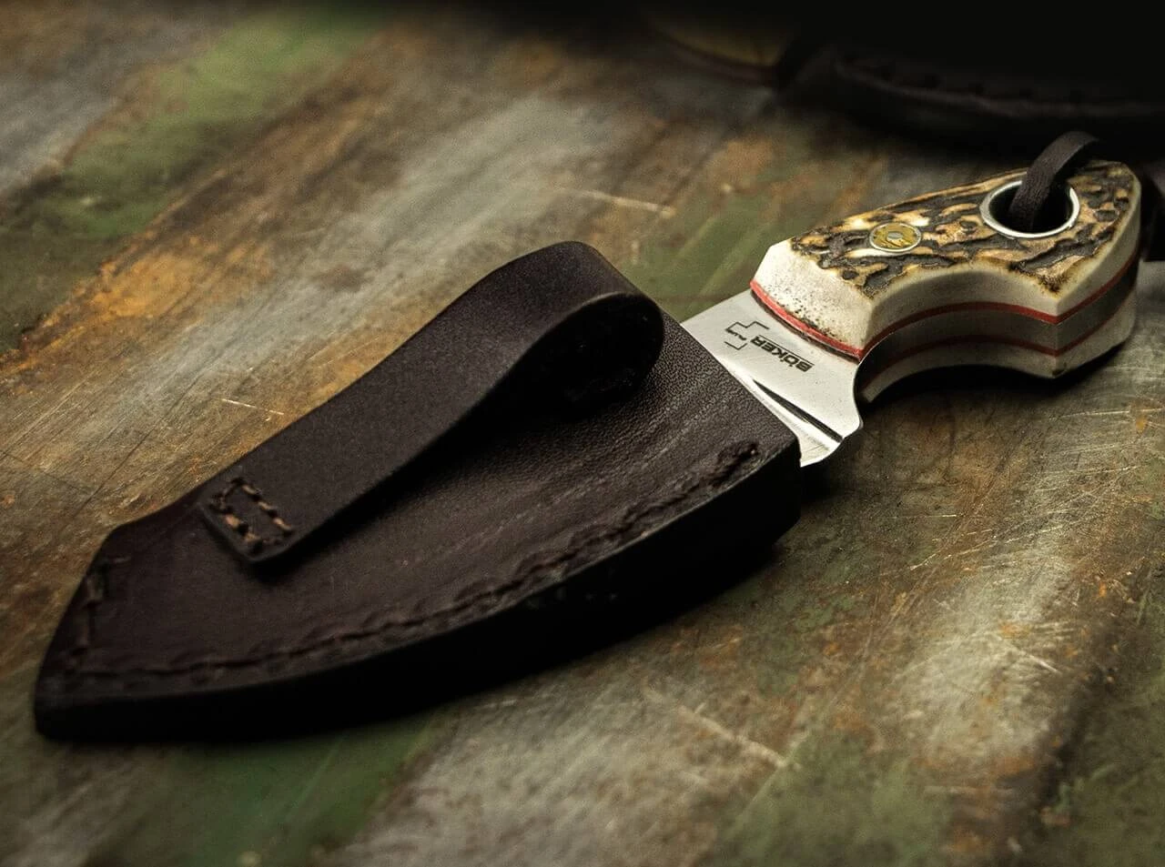 Das Böker Plus Gnome von Jesper Voxnæs begeistert durch seine ultimative Kompaktheit, die einen überragenden Tragekomfort gewährleistet. Die Klinge wird aus 440C gefertigt, die Griffschalen aus traditionellem Hirschhorn sind mit roten Fiberlagen versehen. Sie geben der Hand trotz der geringen Größe ausgezeichneten Halt und machen das Messer nicht nur zu einem Handschmeichler, sondern auch zu einem nützlichen Begleiter auf der Jagd. Die Hirschhornbeschalung wird mit einer großen Hohlniete und einem Mosaikpin montiert. Der Klingenspiegel ist poliert und der Anschliff ist längssatiniert. Lieferung mit Lederfangriemen und hochwertiger brauner Lederscheide mit Gürtelschlaufe.