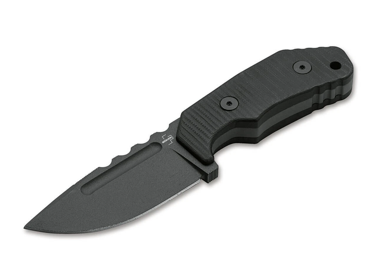 Das feststehende Messer überzeugt mit seiner kompakten Baugröße und wuchtigen Spearpoint-Klinge aus D2, die mit einer dunkelgrauen Titanbeschichtung und einer ausgeprägten Hohlkehle versehen ist. Die Riffelung am Klingenrücken verspricht eine sichere Daumenablage bei schwierigen Schneidarbeiten. Dem Zorn der Götter zum Trotz liegt der wohlgeformte und in Teilen geriffelte Griff aus G10 stets sicher in der Hand. Mit einem handelsüblichen 3D-Drucker lassen sich alternative Griffschalen in den verschiedensten Formen, Farben und Materialien einfach selbst ausdrucken. Mit Fangriemenöse, Gürtelclip und hochwertiger Kydexscheide.