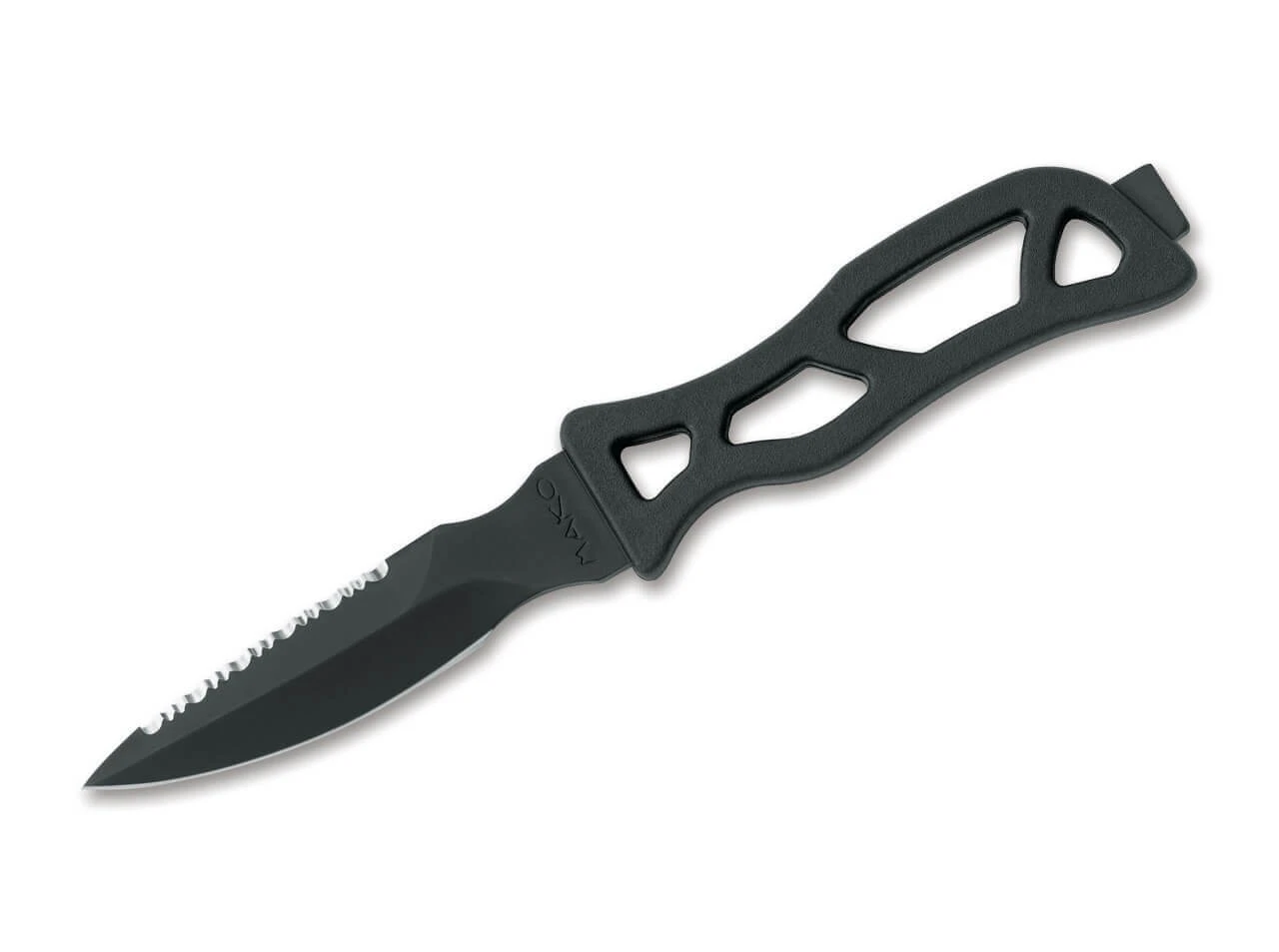 Das professionelle Tauchermesser Mako 2 von MAC ist mit einer abriebfest beschichteten Klinge aus 4116 ausgestattet, die zusätzlich über einen bissigen Wellenschliff verfügt. Der schwarze Griff aus rutschfestem TPE liegt auch unter Wasser sicher in der Hand. Lieferung mit PE-Scheide mit Gummibändern für Beine oder Arme.