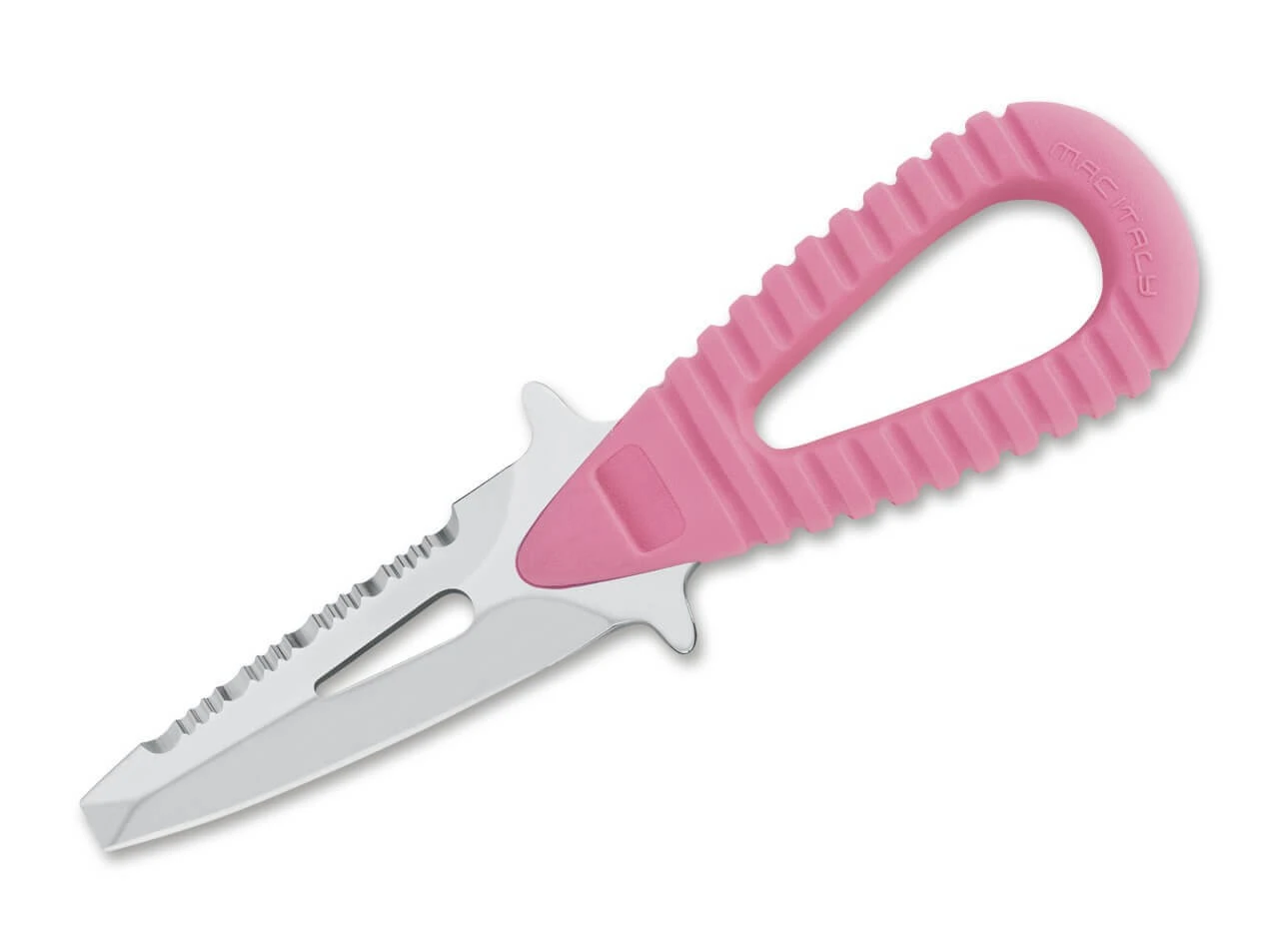 Das MAC Microsub PT verfügt über einen kompakten pinkfarbenen Kunststoffgriff. Die Meißel-Klinge aus 4116 ist mit einem Wellenschliff am Klingenrücken versehen und ist zusätzlich mit einem Schäkellöser ausgestattet. Mit beidseitig tragbarer, rastender Kunststoffscheide mit Beingurten. Das Messer kann aber auch als Neck Knife getragen werden.