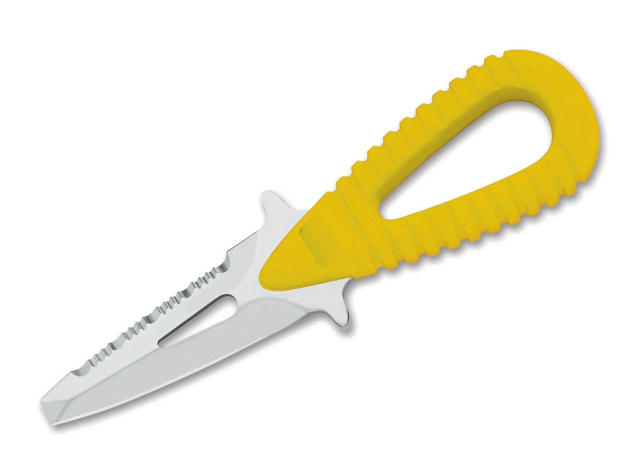 Das professionelle Tauchermesser Microsub von MAC ist mit einer Klinge mit Meißelspitze aus 4116 ausgestattet, die zusätzlich über einen bissigen Wellenschliff und einen Schäkellöser verfügt. Der gelbe Griff aus rutschfestem ABS liegt auch unter Wasser sicher in der Hand. Lieferung mit Polypropylen-Scheide mit Gummibändern für Beine oder Arme. Das Messer kann aber auch als Neck Knife getragen werden.