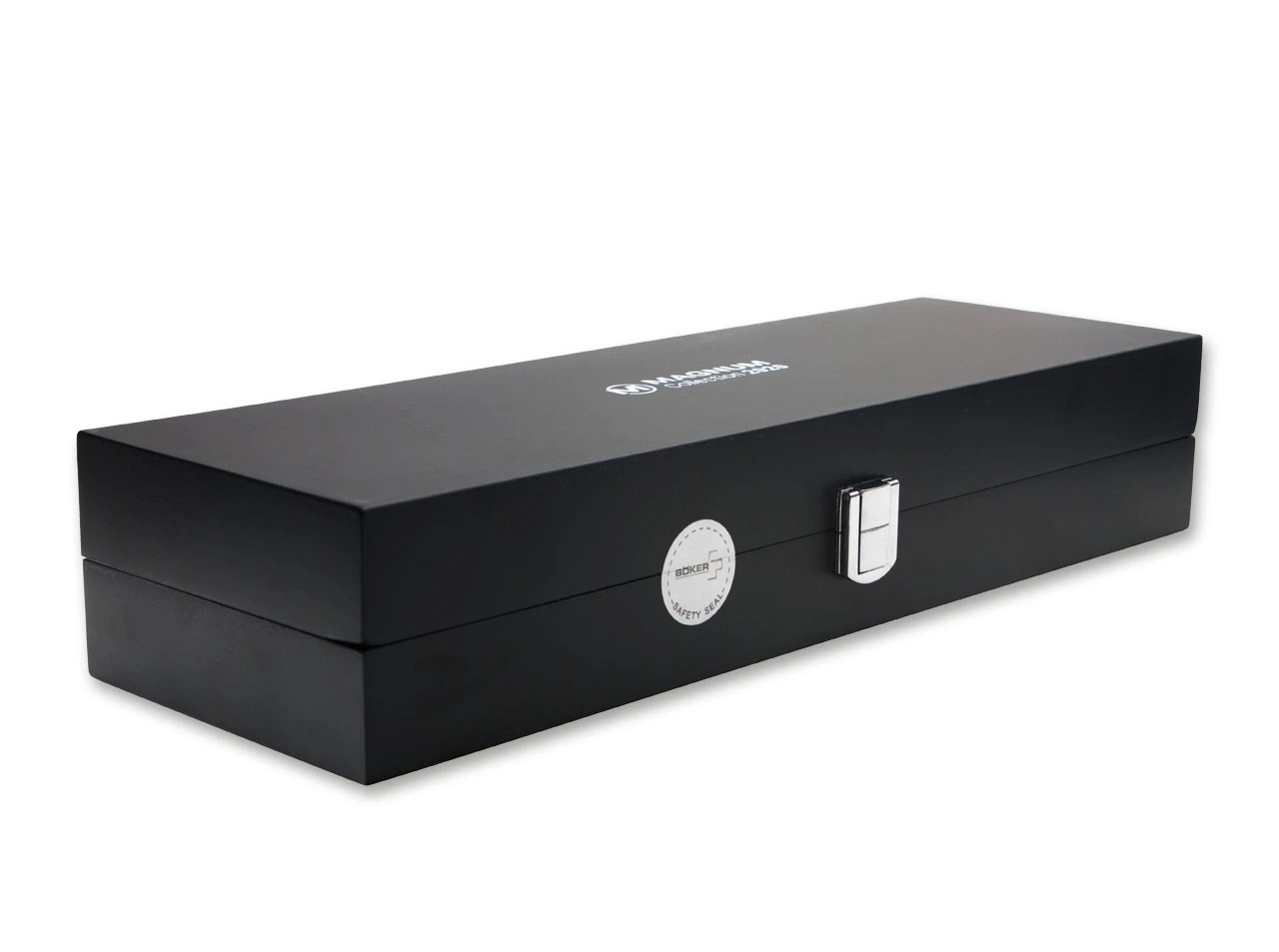 Mit der wuchtigen Spearpoint-Klinge aus fünf Millimeter starkem D2, den wir erstmals in der Magnum Collection Serie verarbeiten, gibt er dem Messer die Einsatzeigenschaften, die man von einem echten Gebrauchsmesser erwarten kann. Sie ist mit einer langen Fehlschärfe, einer ausgeprägten Hohlkehle und Riffelungen im Bereich der Daumenauflage versehen. Eine Kombination aus Stonewash– und Satin-Finish macht die Klinge unempfindlicher gegenüber Kratzern und verbessert gleichzeitig die Korrosionsbeständigkeit. Die massive Vollerlkonstruktion verleiht dem Magnum Collection 2020 sowohl die nötige Balance als auch die erforderliche Stabilität, sodass sich das Messer jederzeit zuverlässig einsetzten lässt. Die Griffschalen aus texturiertem G10 werden mittels Sandstrahl mattiert und bieten so einen eleganten Kontrast zur Klinge. Mit Fangriemenöse und schwarzen Lederscheide. Das Magnum Collection 2020 ist weltweit auf 1.999 Stück limitiert. Die Auslieferung erfolgt in einer exklusiven Sammlerschatulle und mit Echtheitszertifikat.